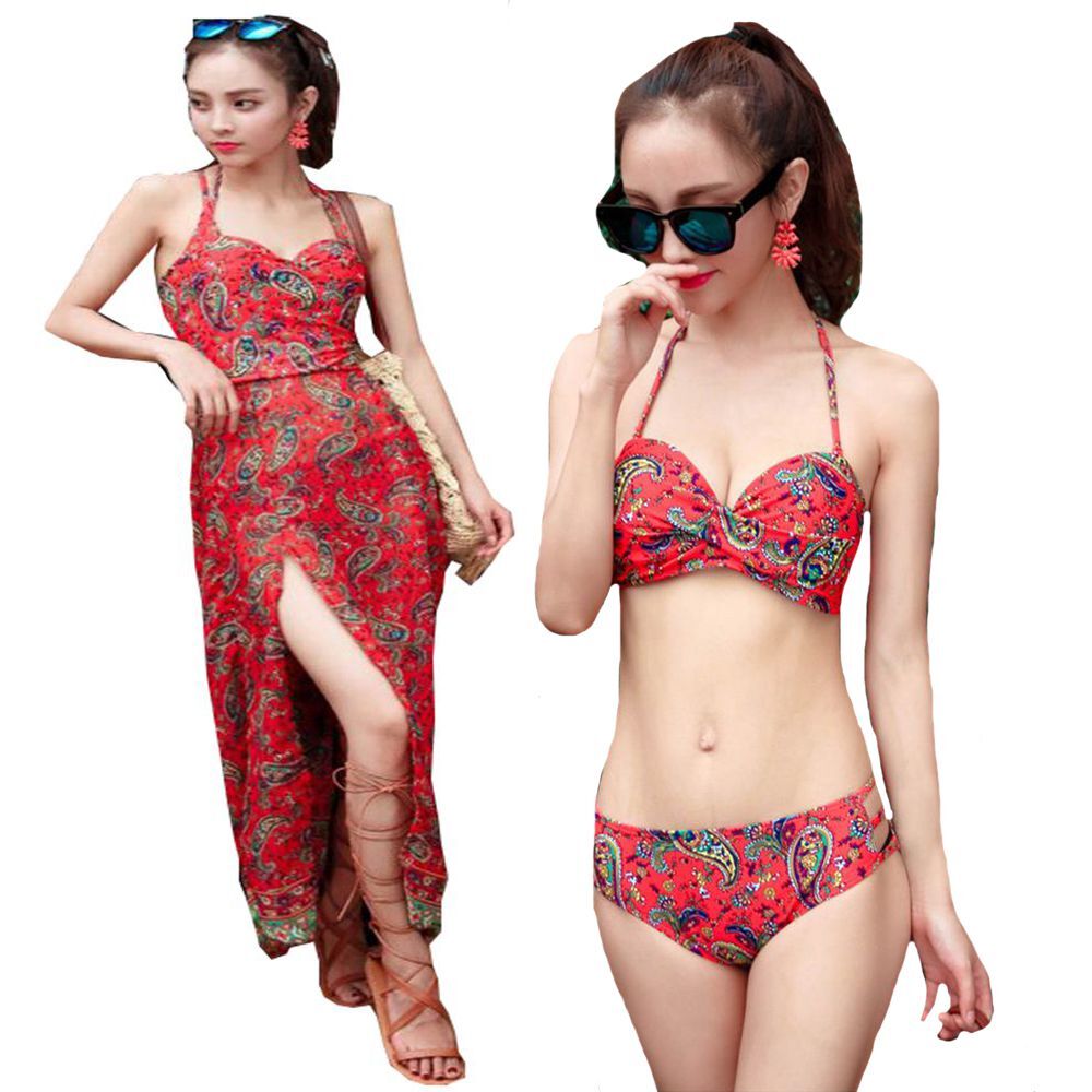 予約 水着 レディース レディース水着 3点セット エスニック エスニック柄 ペイズリー ビキニ ワンピース スリット かっこいい 体型カバー ボタニカル M L Xl 7号 9号 11号 ロングワンピース サイドスリット セクシー プール ビーチ リゾート 大人 代 30代 40代 W1014